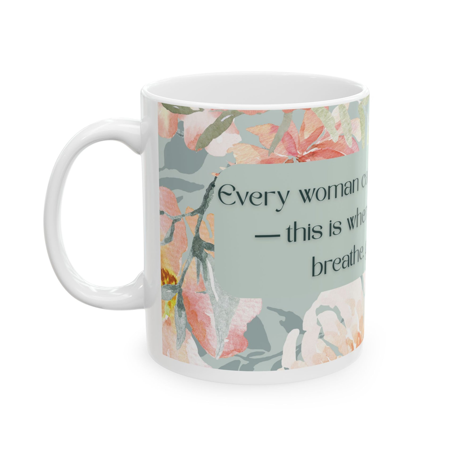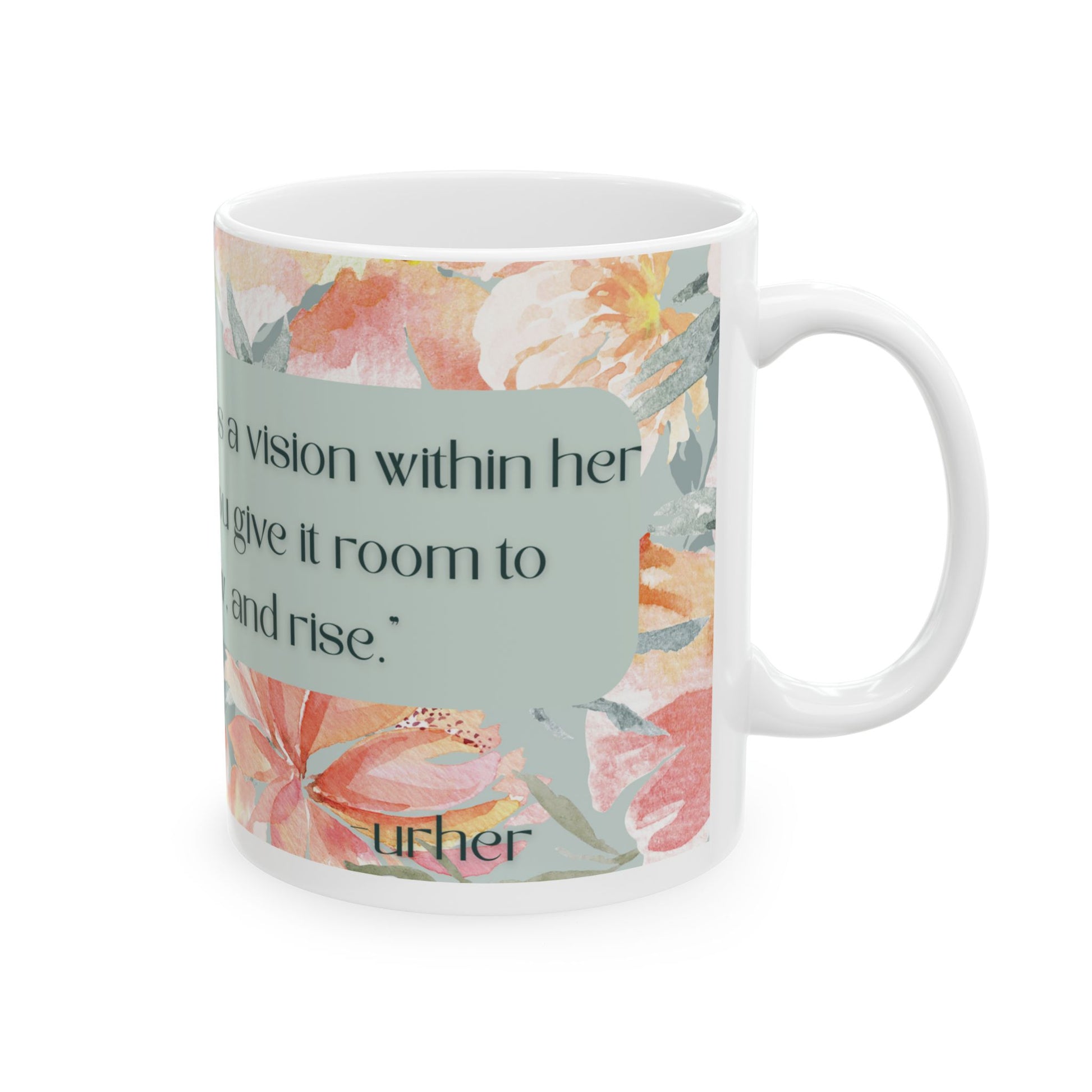 “Every woman carries a vision within her—this is where you give it room to breathe, grow, and rise.” Warm, watercolor florals wrap this glossy ceramic mug like a soft invitation to slow down.