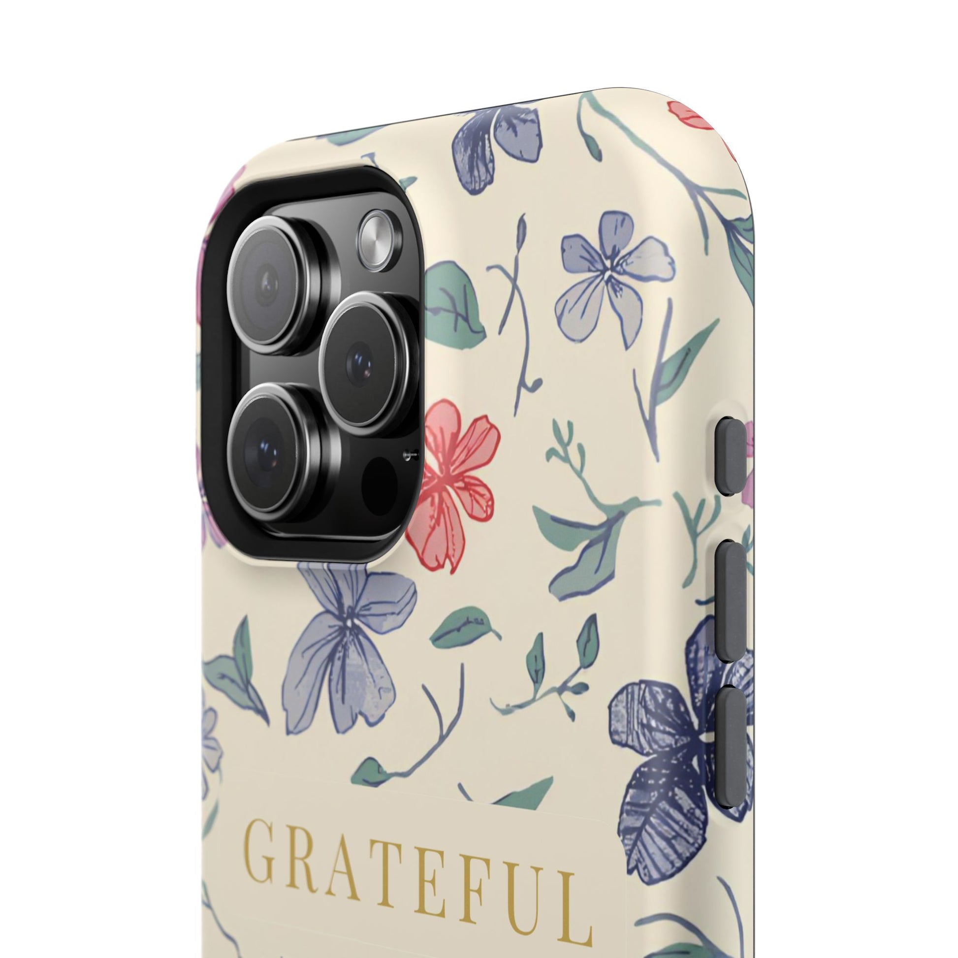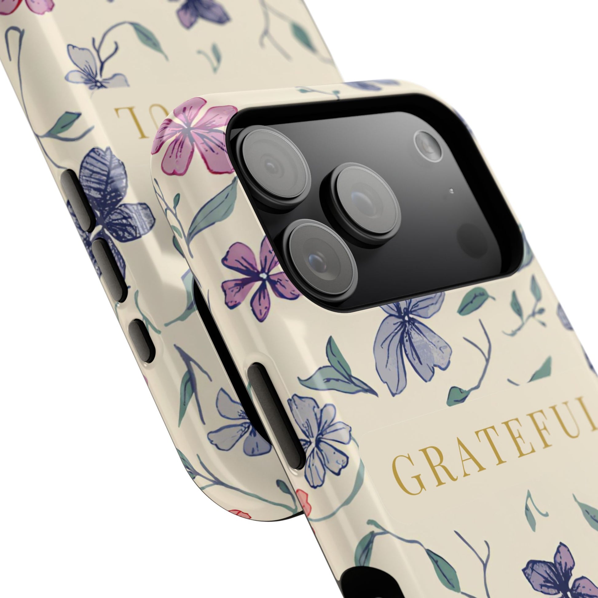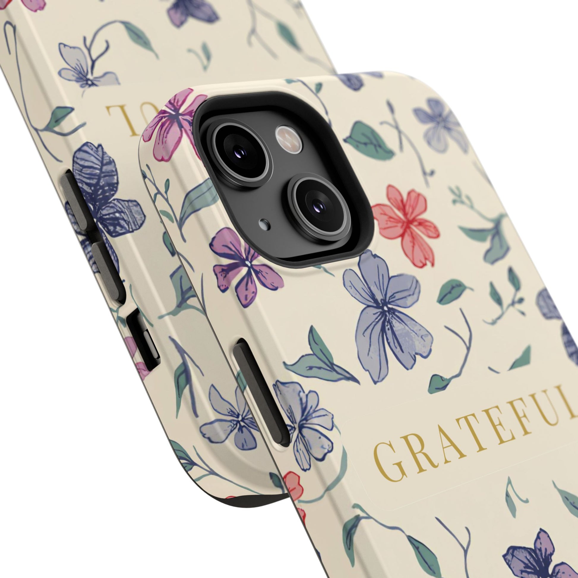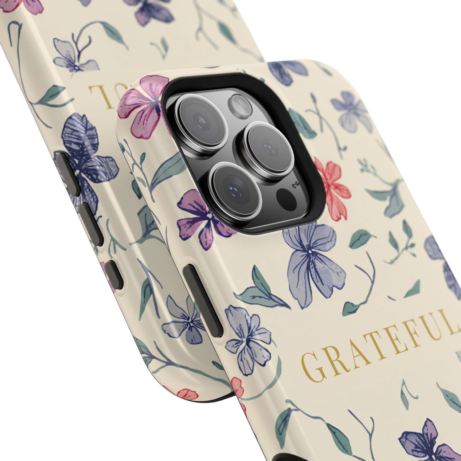 A slim, impact-resistant phone case that pairs soft, vintage-inspired watercolor florals with a quiet, gold-lettered reminder: GRATEFUL. The dual-layer design cushions against everyday bumps while the photo-realistic print wraps the sides for a continuous, artisanal look. Choose glossy for a luminous finish or matte for a subtle, modern feel. Lightweight and wireless-charging compatible, this case keeps your phone safe without hiding the personality that matters — gentle, thoughtful, and mindful in every small moment.