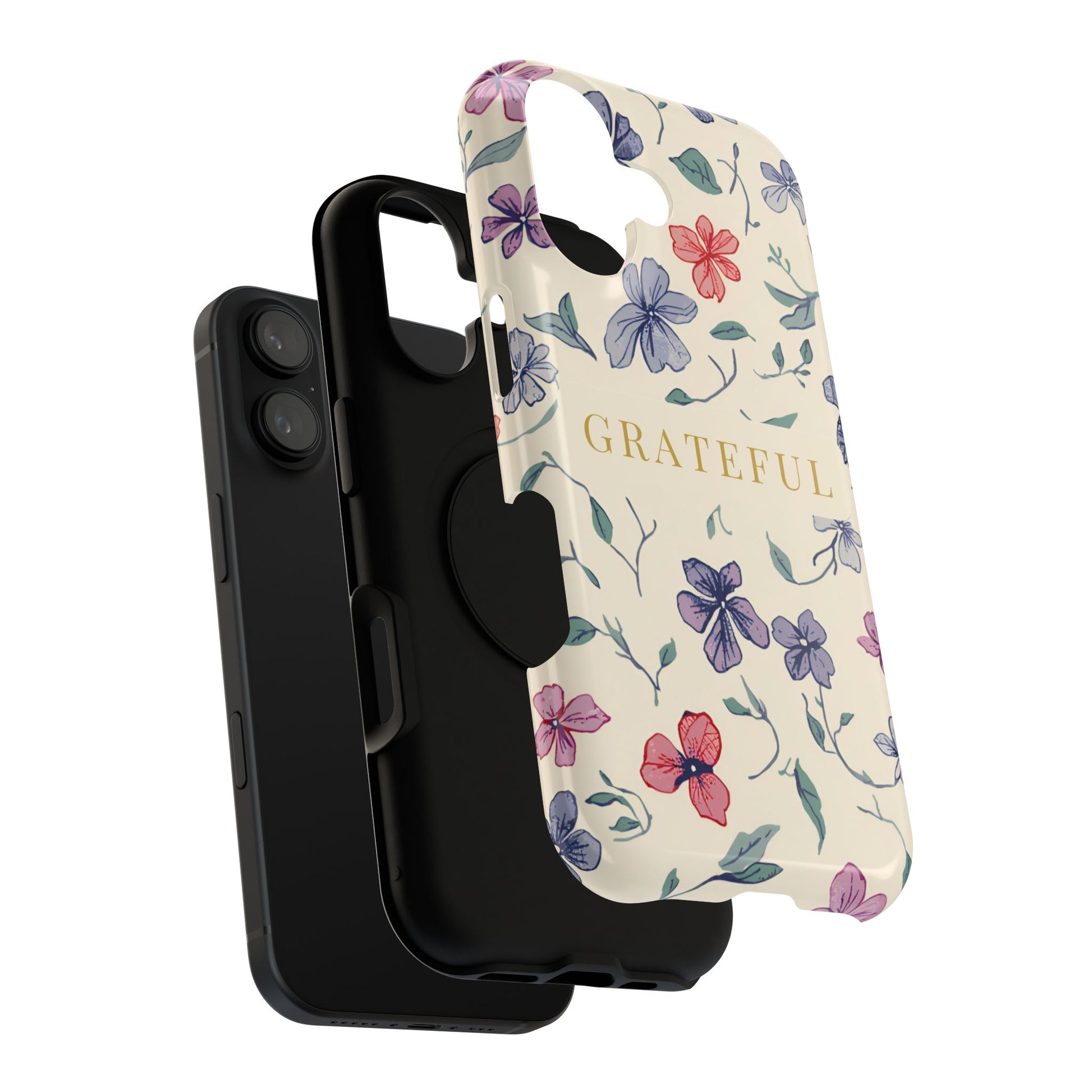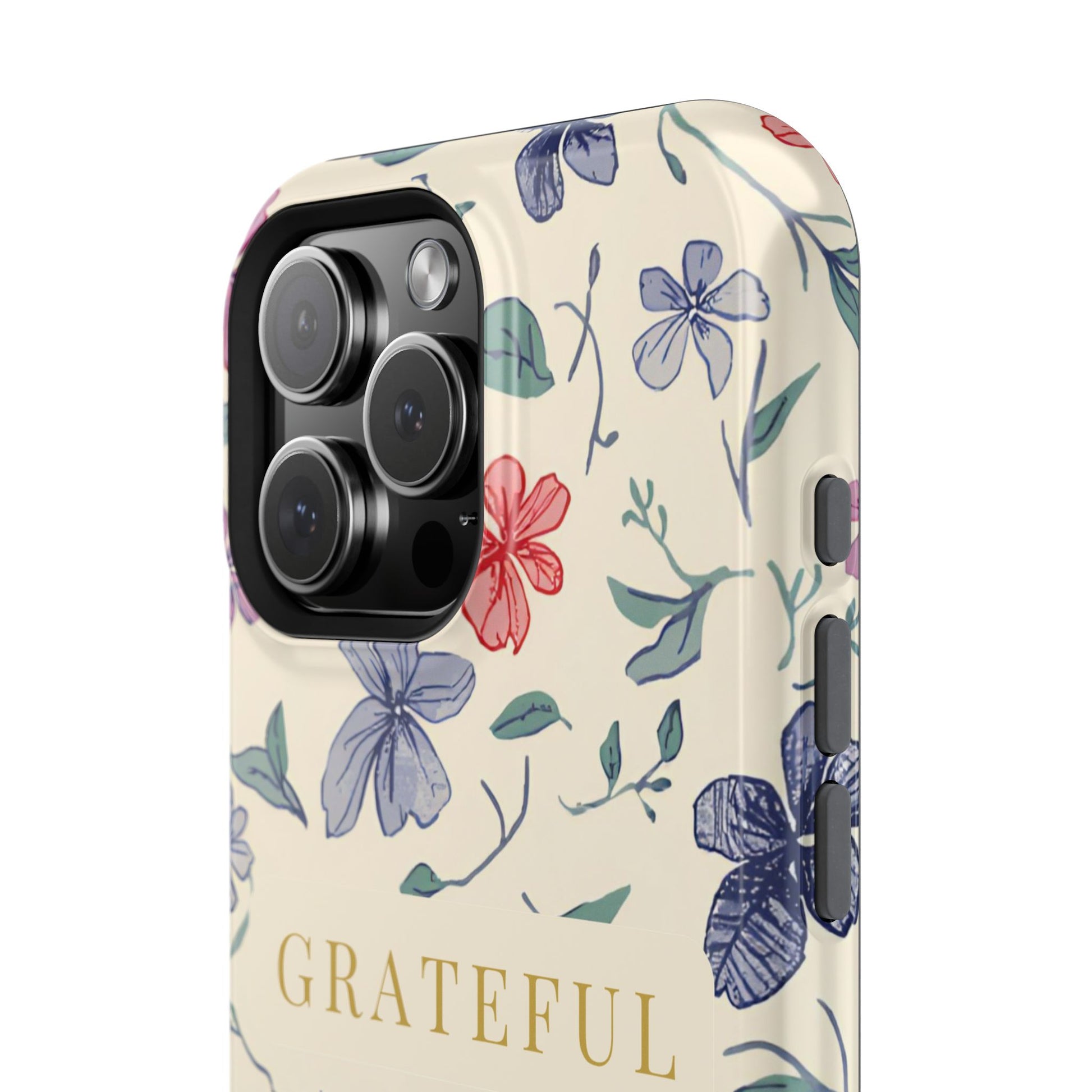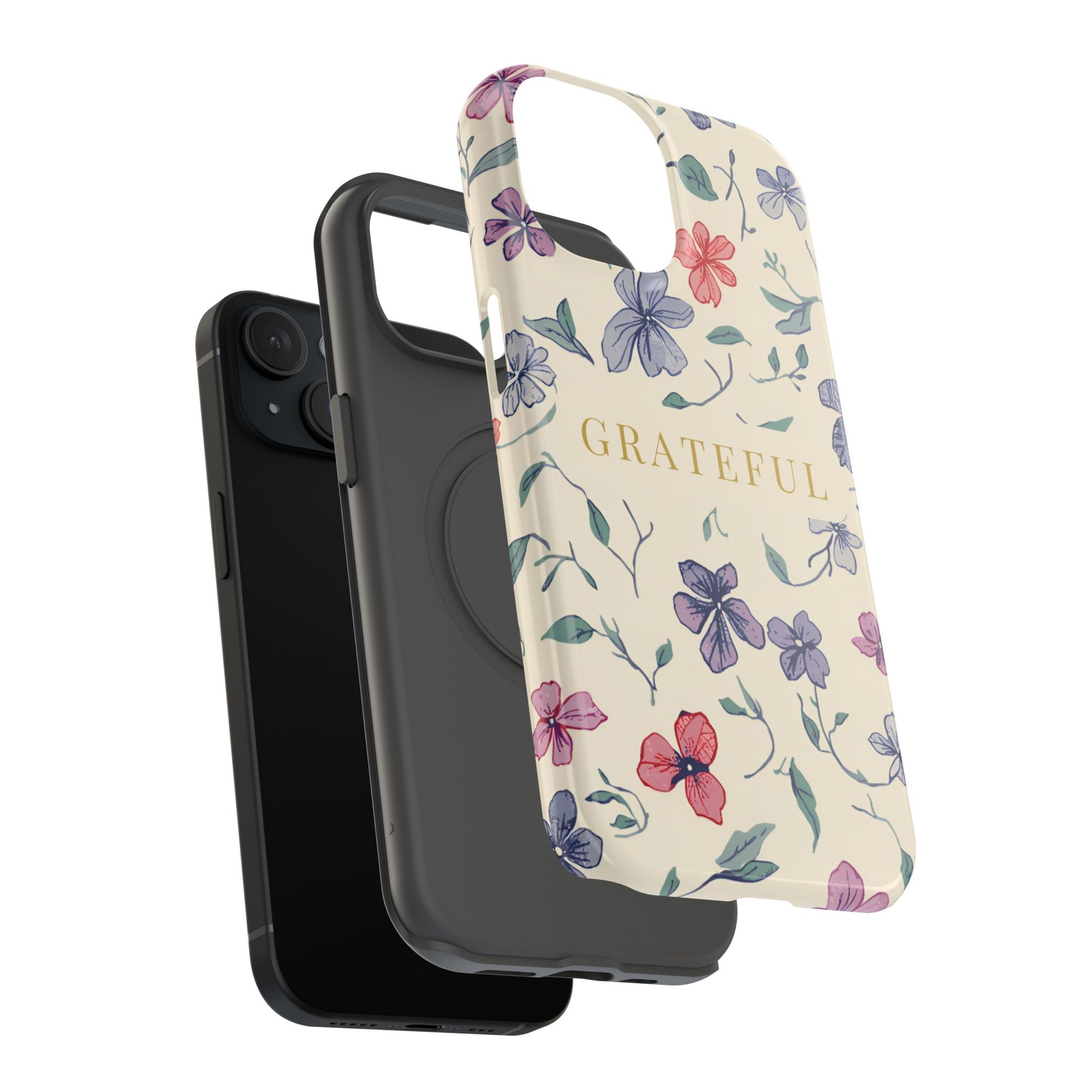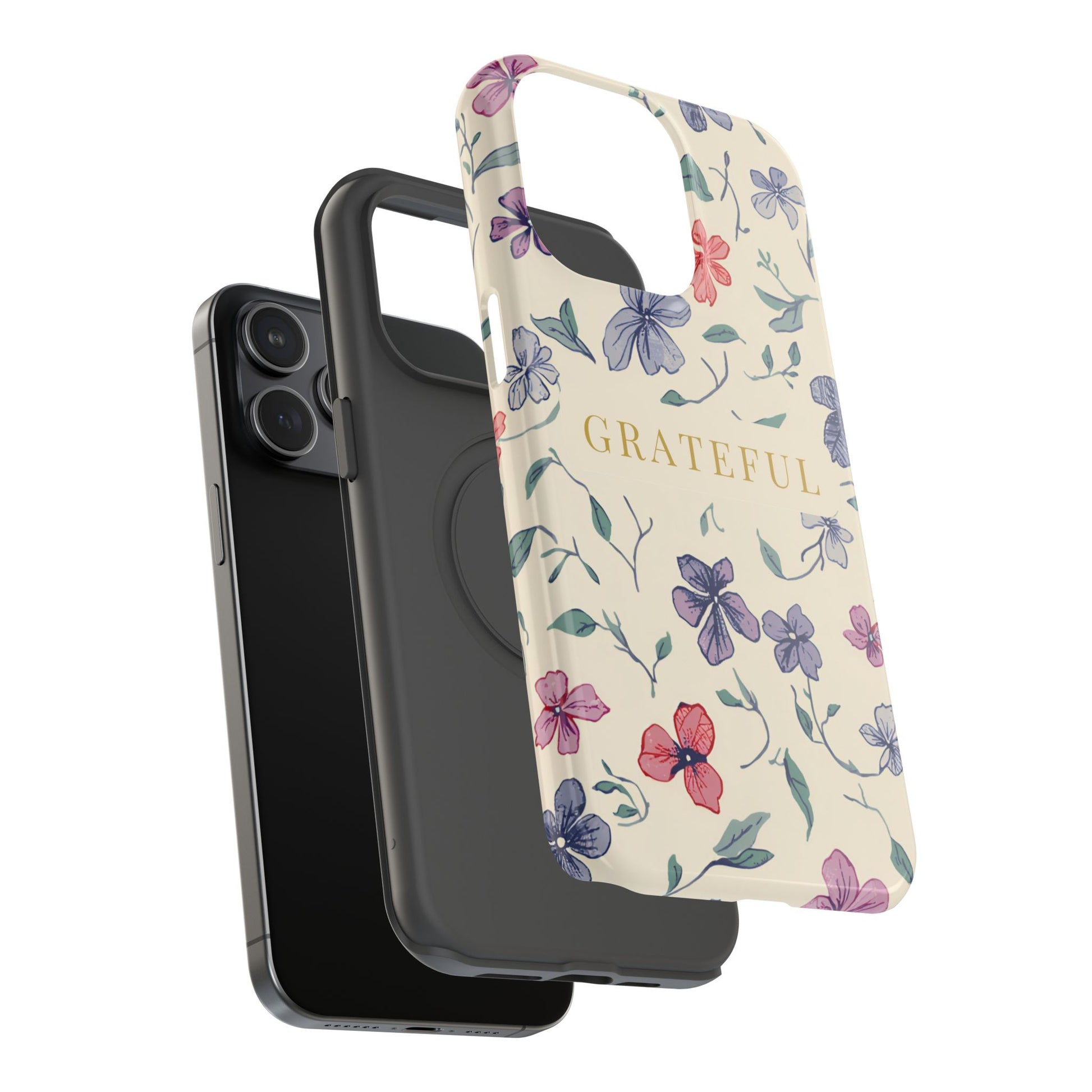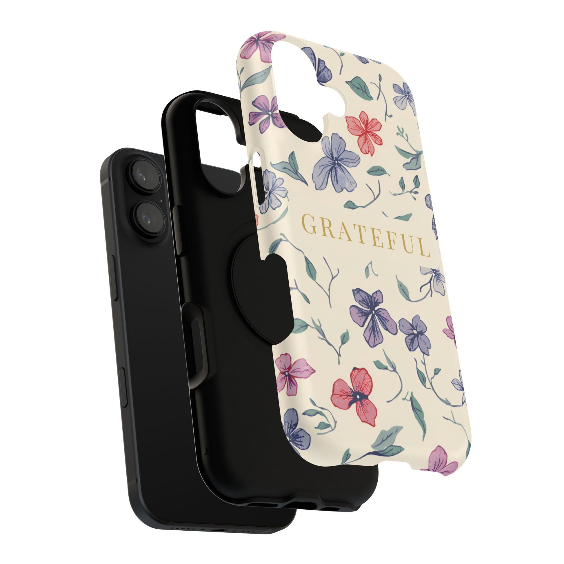 A slim, impact-resistant phone case that pairs soft, vintage-inspired watercolor florals with a quiet, gold-lettered reminder: GRATEFUL. The dual-layer design cushions against everyday bumps while the photo-realistic print wraps the sides for a continuous, artisanal look. Choose glossy for a luminous finish or matte for a subtle, modern feel. Lightweight and wireless-charging compatible, this case keeps your phone safe without hiding the personality that matters — gentle, thoughtful, and mindful in every small moment.