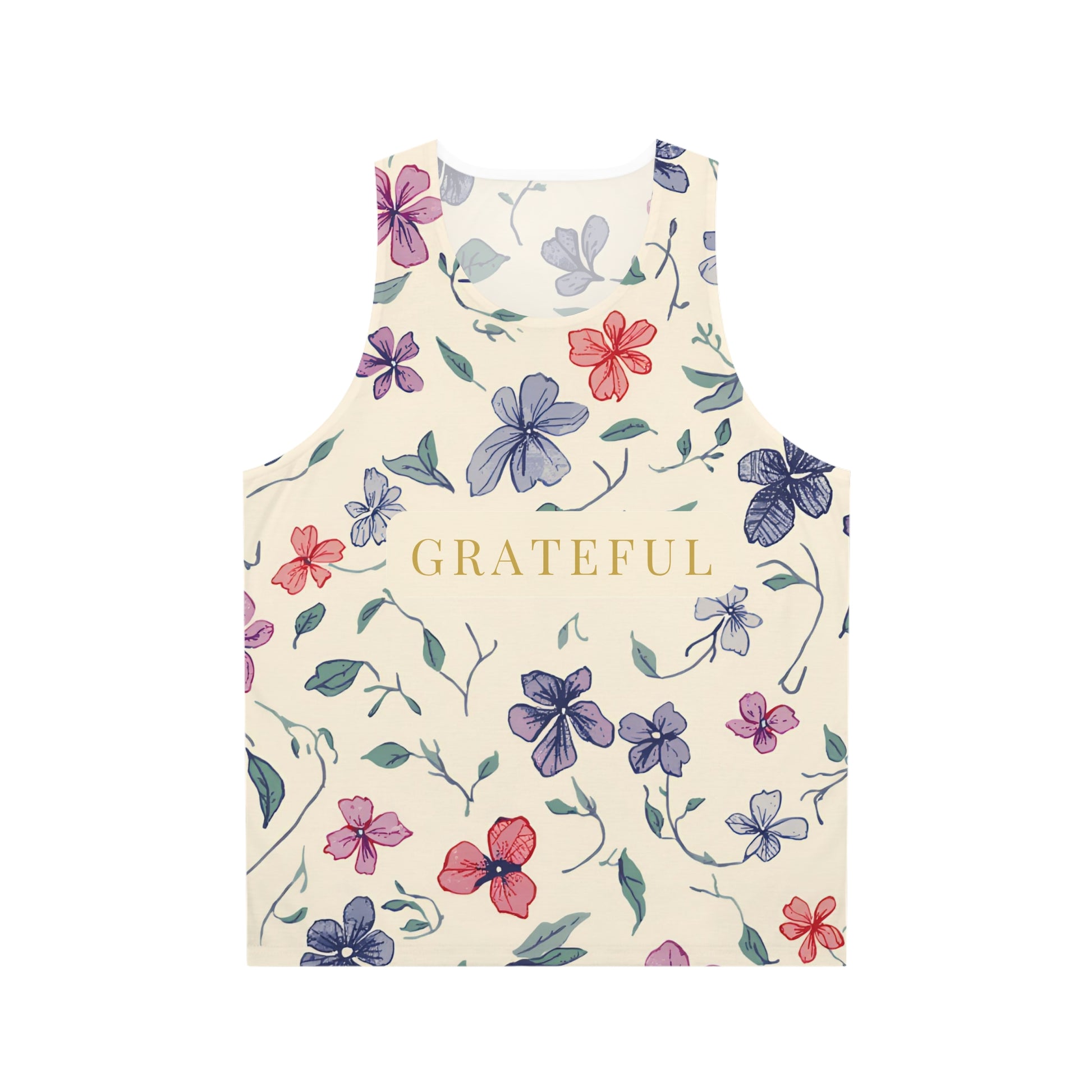 A lightweight floral tank that feels like a breath of spring. Soft watercolor blooms in muted purples, pinks, and greens drift across a warm cream background, with a simple, gold-lettered “GRATEFUL” across the chest. It’s airy and easy — made to layer over a tee for city strolls or worn alone on warm mornings. The recycled polyester keeps the print vivid and the fit relaxed, so the top moves with you during farmers’ market runs, backyard coffee breaks, or quiet moments of reflection. Wear it when you want a gentle reminder to slow down and notice small joys.